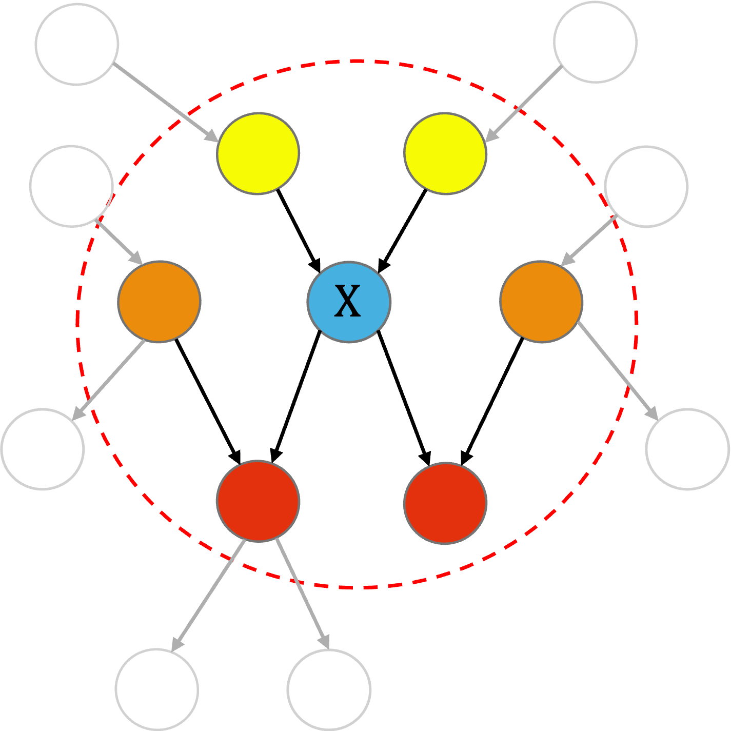 An important concept in CGBNs is the Markov blanket of a node, defined as the minimal set of variables that renders the node conditionally independent of all other variables in the network. For a given node, its Markov blanket consists of its parents, its children, and its spouses (i.e., the other parents of its children). As illustrated in the following figure, we use yellow, orange, and red to denote the parents, spouses, and children of node , respectively.