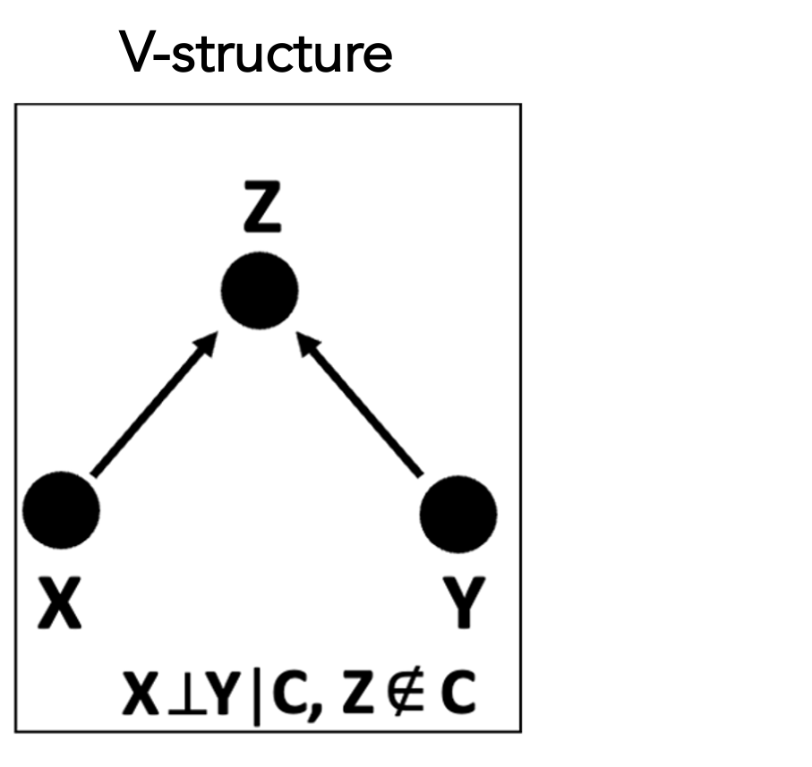 Structure learning in CGBNs is typically performed using constraint-based methods, which infer the network topology by testing conditional independence relationships implied by the data. Starting from a complete graph, edges are iteratively removed when conditional independence between variable pairs is detected given appropriate conditioning sets. A key step in orienting edges in the resulting partially directed graph is the identification of v-structures, of the form . A v-structure is inferred when two variables and are marginally independent but become conditionally dependent upon conditioning on a third variable , as illustrated in the following figure: