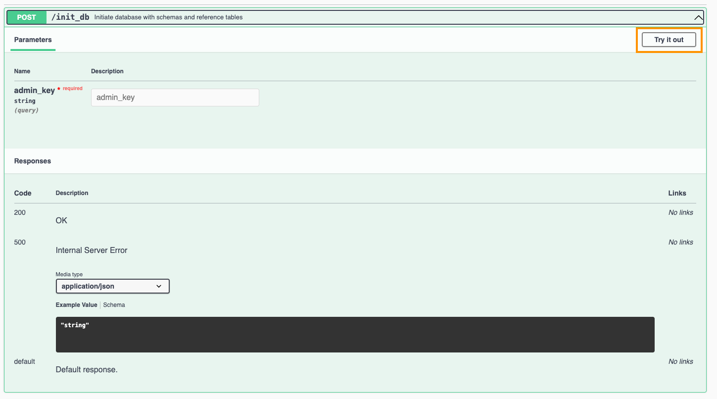 endpoint is specifically used to initialize the database with its schema and essential reference tables such as organisms, phenotypes, platforms, sample types, etc.To execute this endpoint, click the “Try it out” button in the API directive. This opens an interactive prompt where you can run the API directly. You will need to provide an Admin Key for authentication before execution.