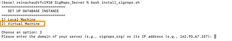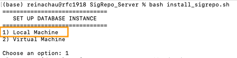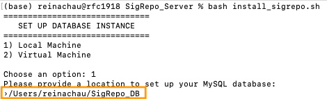 - Next, when prompted for a location to set up the MySQL database, enter the full path to the SigRepo_DB directory you created in step (2).